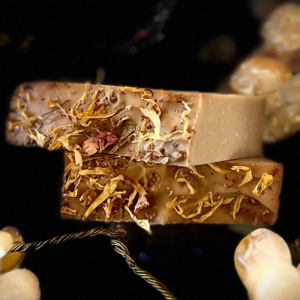 Calendula + Rose petals on top of a colloidal gold soap bar.