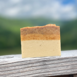 This goat colostrum custom soap bar features layered annatto seed powder, purple clay and papaya & calendula extract